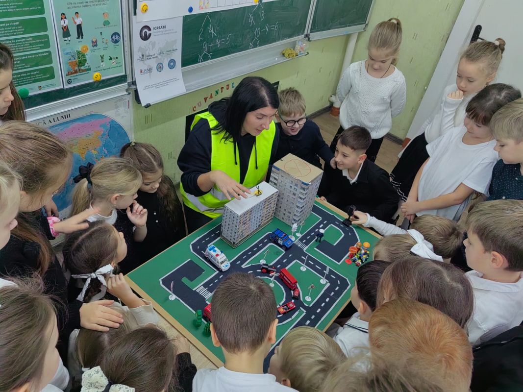 Practical activities were also carried out by primary school students from Mihail Sadoveanu Theoretical High School in Hincesti town, who became acquainted with the main road signs and participated in interactive exercises on how to cross a street safely and the responsible behavior of pedestrians. The activity had the role of consolidating theoretical knowledge and forming safe practical skills from an early age.